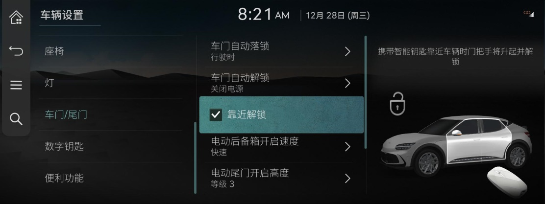 2)其次需在车机端中选择【设置】 > 【车辆】 > 【车门/尾门】> 选择【靠近解锁】 ( Smart Approach Unlock 功能)